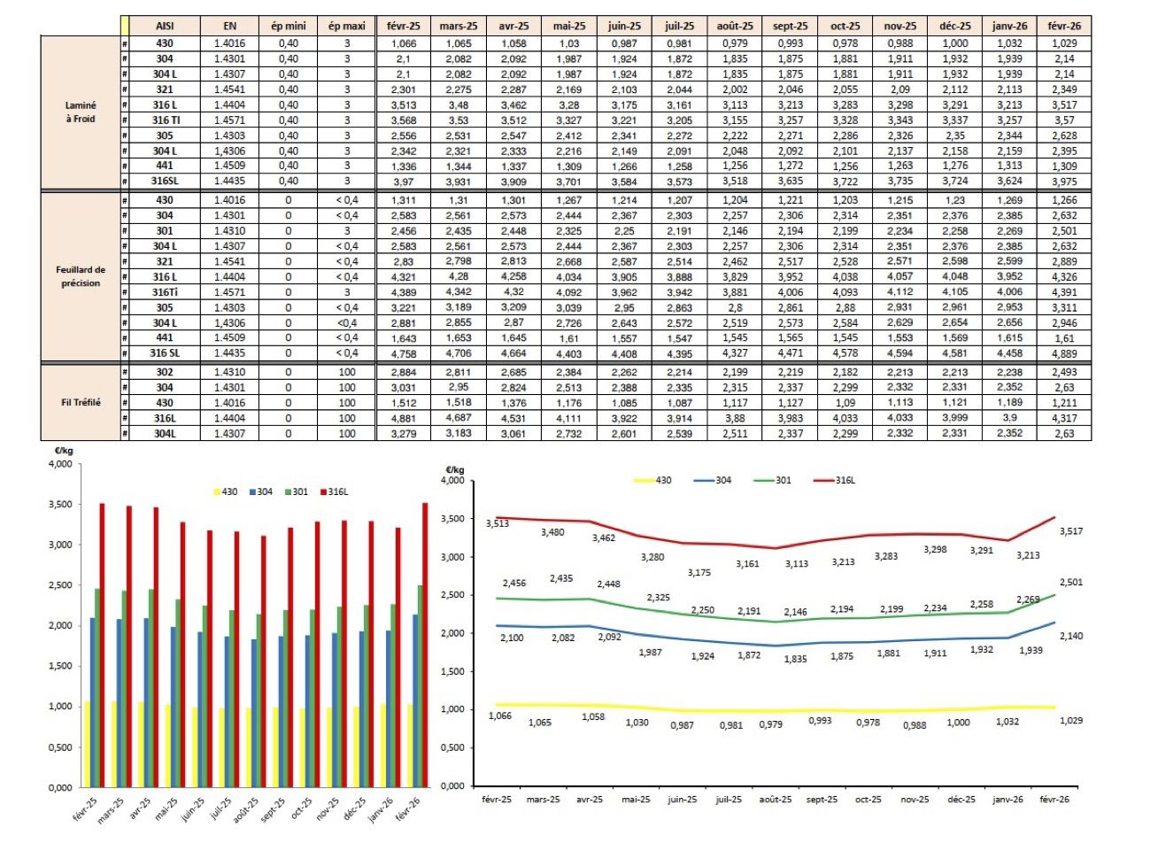 After a year in 2025 marked by stabilisation and even a slight decline in alloy surcharge prices for different grades of stainless steel compared to 2024, the beginning of 2026 saw a sharp rise in prices, which returned to 2024 levels.
